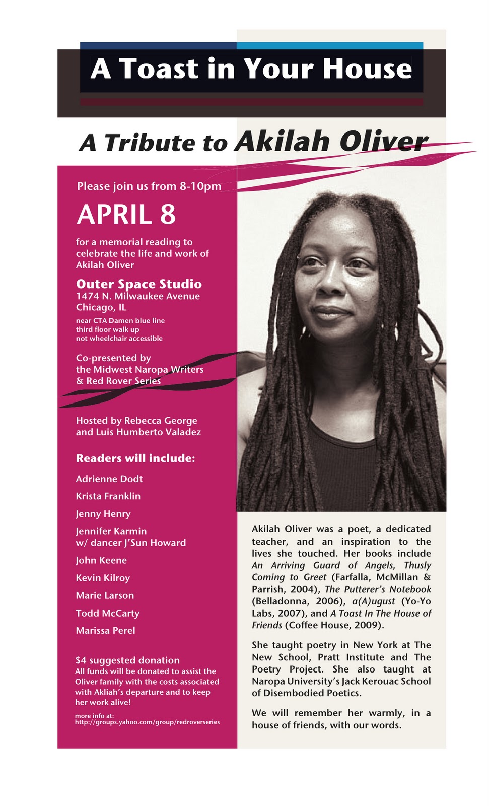 Last month, the poet, teacher, performer, activist, mother, sister, and friend to so many, Akilah Oliver (1961-2011), admired, respected and beloved by many in the poetry community, passed away suddenly. (I wrote up a little tribute, but have not yet posted it, so that's coming.) For many this has been great loss of an important and energizing creative spirit who died far too young. This Friday, April 8, 2011, in Chicago, the Midwest Naropa Writers and Red Rover Series are co-presenting A Toast in Your House: a memorial reading to celebrate the life & work of Akilah Oliver.
